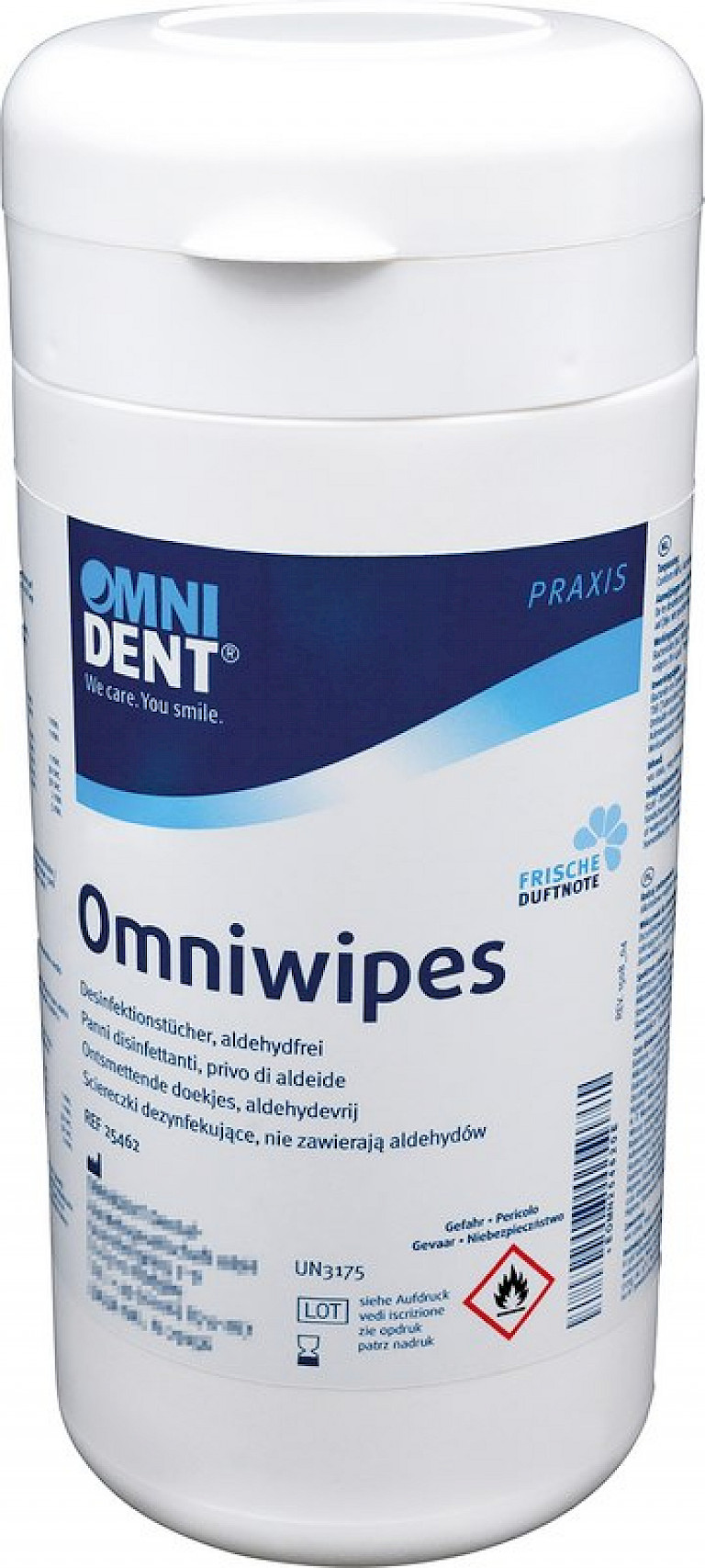 Alkoholische Feuchttücher zur prophylaktischen Oberflächendesinfektion von alkoholbeständigen Medizinprodukten sowie zur schnellen Desinfektion von kleinen Flächen, insbesondere Hand- und Winkelstücken, Behandlungseinheiten und Arbeitstischen in Zahnarztpraxen. Aldehydfrei. Flüssigkeit ist VAH-gelistet. 100 Tücher, Format 12 x 20cm. Wirkungsspektrum (Tränkflüssigkeit): Bakterien und Candida albicans nach EN13727, EN 13624 und EN 13697 (hohe Belastung) TbB (Tuberkulose)-Inaktivierung (M.terrae) nach EN 14348 (hohe Belastung), wirksam gegenüber behüllten Viren (z. B. HBV/HIV/HCV) gemäß DVV/2012. Einwirkzeiten nach Standardmethoden der VAH: Konz.: 1 Minute*; Adeno-, Rota-, Noro-Viren nach EN14476 (hohe Belastung) 1 Minute*, begrenzt viruzid Plus. Einwirkzeiten (bezogen auf die getränkten Tücher) Bakterien und Candida albicans (VAH, und EN 16615, hohe Belastung): 2 Minuten