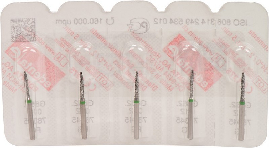 Packung 5 Diamanten grün grob, FG, Figur 249 Flamme, Kopflänge: 8 mm, ISO 012