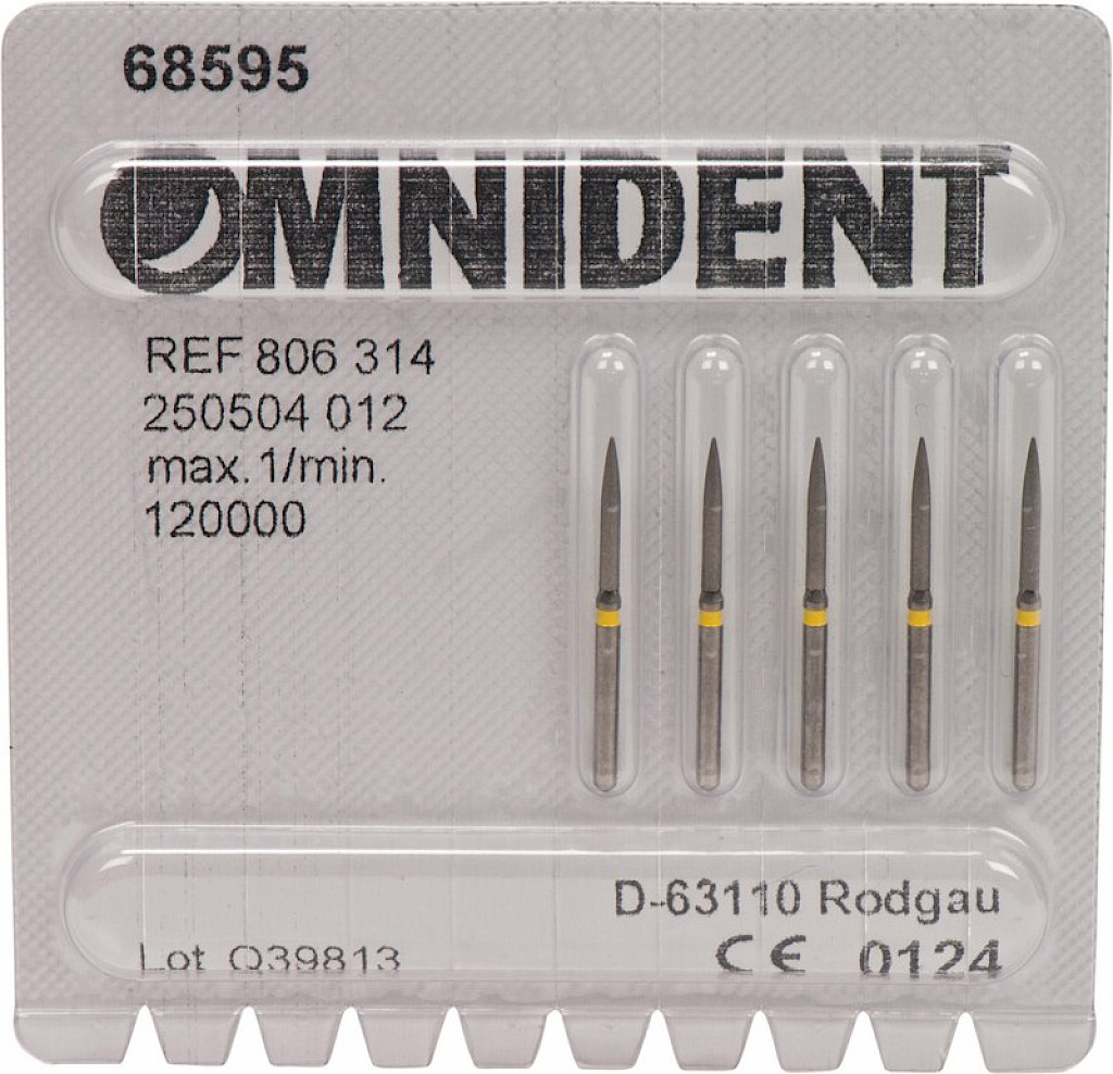 Packung 5 Diamanten gelb superfein, FG, Figur 250 Flamme, Kopflänge: 10 mm, ISO 012